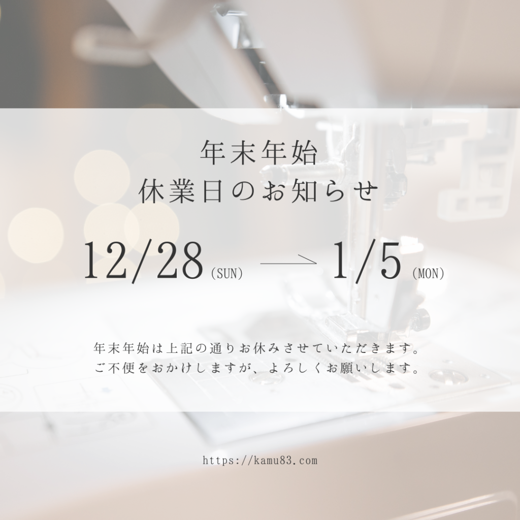 平素より洋服の補正カムをご利用いただき、誠にありがとうございます。下記の期間を休業とさせていただきます。 休業期間:12月28日(土)~1月5日(日) 新年は1月6日(月)より通常営業いたします。期間中にいただいたお問い合わせは、営業再開後に順次... -